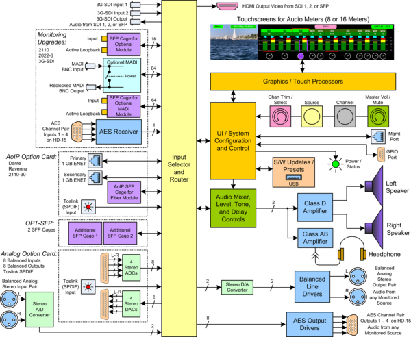 Standard features include 3G-SDI and a pair of Analog inputs and outputs. Upgrade/license other signal formats and processing options, as and when needed, either initially or after purchase. Options for additional signals, include DanteTM or RavennaTM (with hitless 2022-7 support), SMPTE-2110, SMPTE-2022-7, AES3, and MADI.